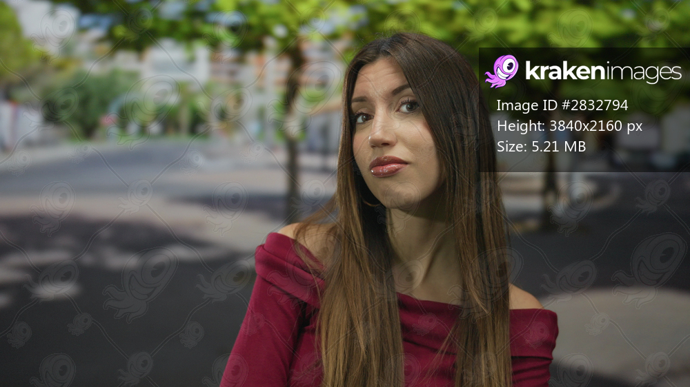Young hispanic woman pouts lips and tilts head on street by leafy trees beside blurred apartment buildings under midday light; confidence.