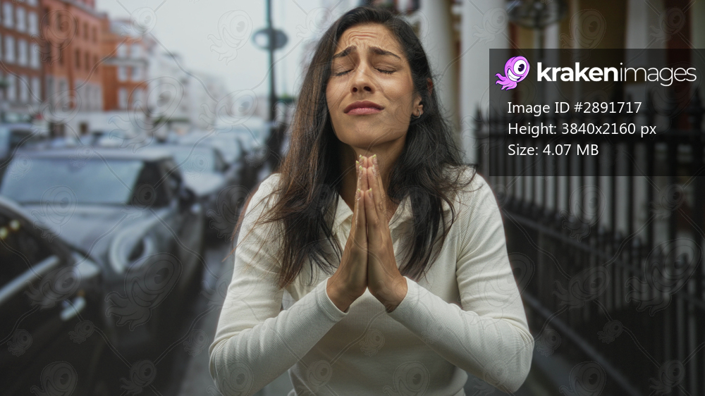 Young hispanic woman praying with hands pressed together in a pleading gesture on a city street lined with parked cars and iron railings; hope.