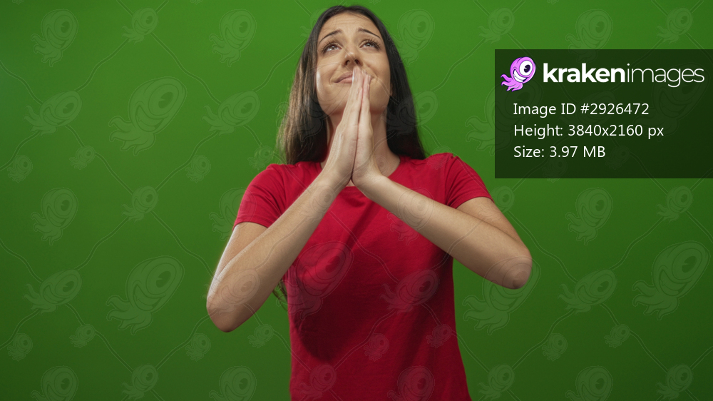 Young hispanic woman praying with hands pressed together in studio with green backdrop wearing red shirt; pleading hope.