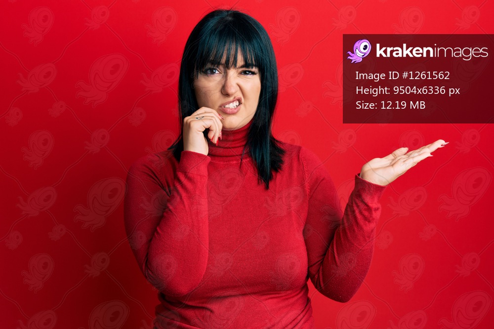 Young hispanic woman presenting with open palms, holding something clueless and confused expression. doubt concept.