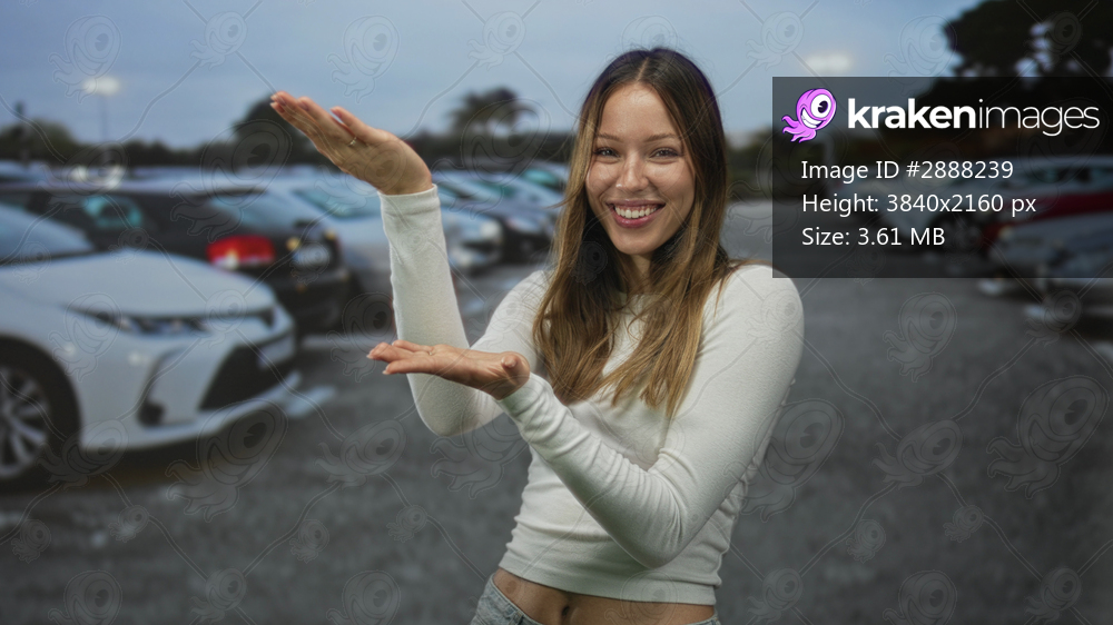 Young hispanic woman presenting palms toward parked cars on a street, smiling with open hands and relaxed posture at a parking row; joyful welcome.
