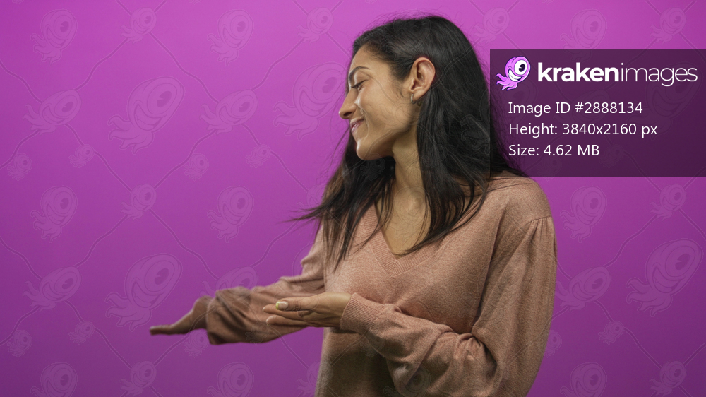 Young hispanic woman presenting with palms up and smiling in studio against magenta wall; warm welcoming joy.