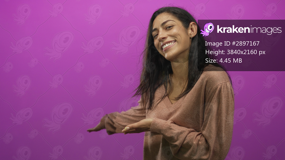 Young hispanic woman presenting with palms up and smiling in studio against magenta wall; warm welcoming joy.