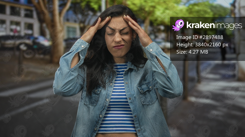 Young hispanic woman presses her temples on a city street wearing denim jacket and striped crop top; stress headache.