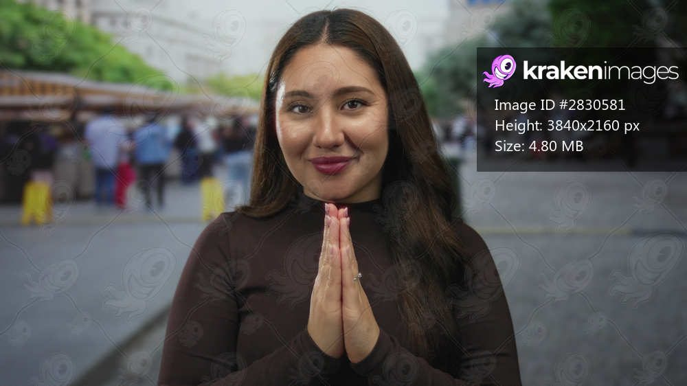 Young hispanic woman presses palms together in prayer gesture on a crowded city street under bright daylight; serenity gratitude.
