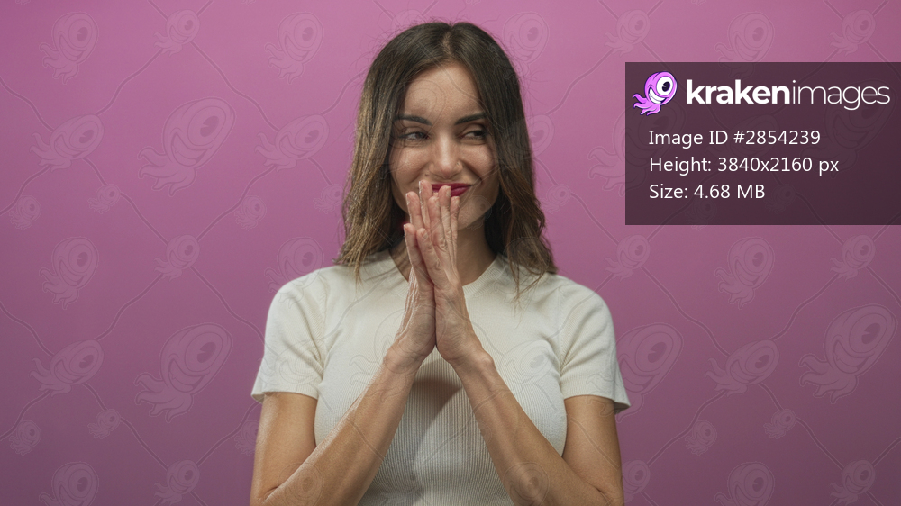 Young hispanic woman presses palms together in studio by pink wall with content smile; hope anticipation.
