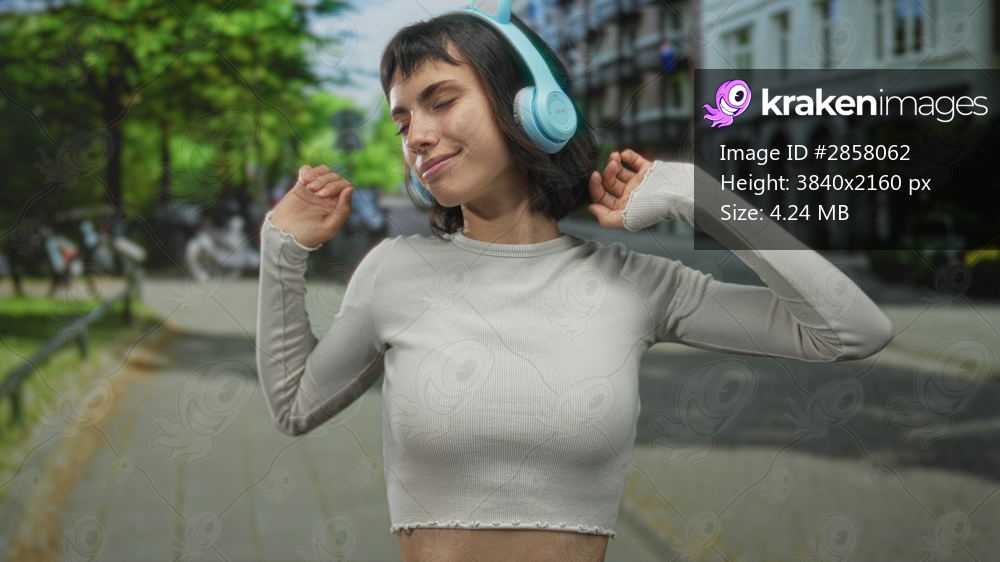 Young hispanic woman presses palms together wearing blue cat ear headphones on street with building and trees; serenity.
