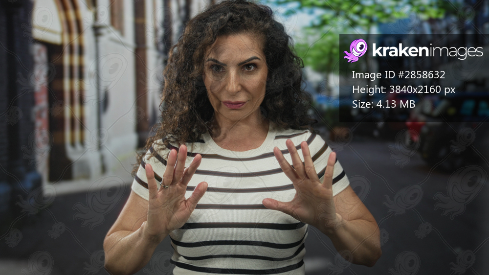 Young hispanic woman pressing both palms downward in calming gesture on bustling city street with parked cars visible; serenity.