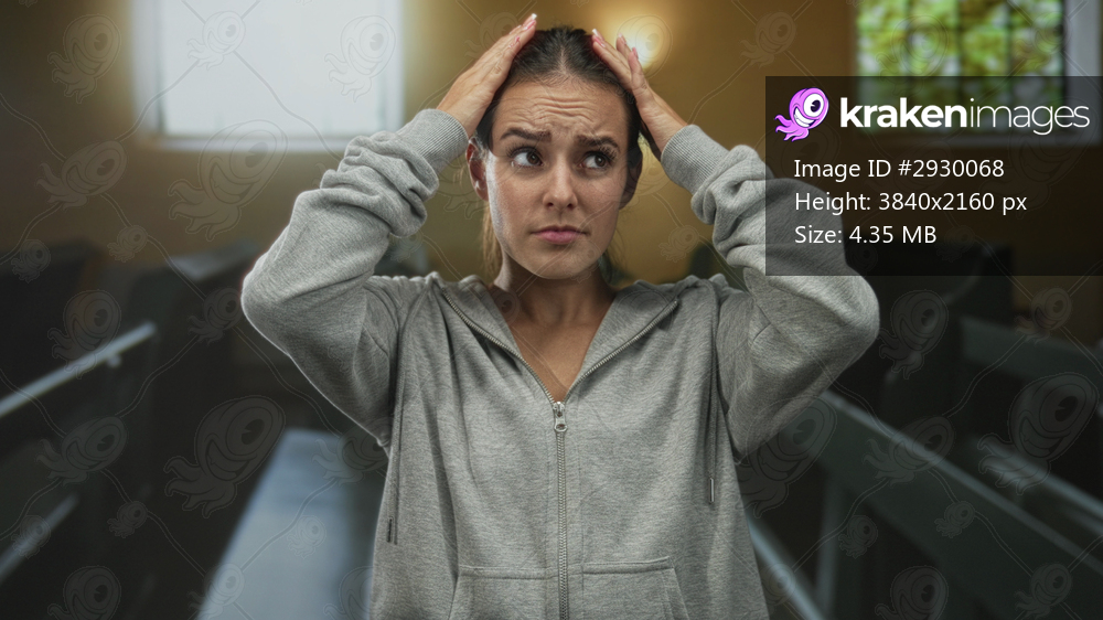 Young hispanic woman pressing cheeks with hands, furrowed brow and closed eyes, gray hoodie, seated in church pews; pain prayer.