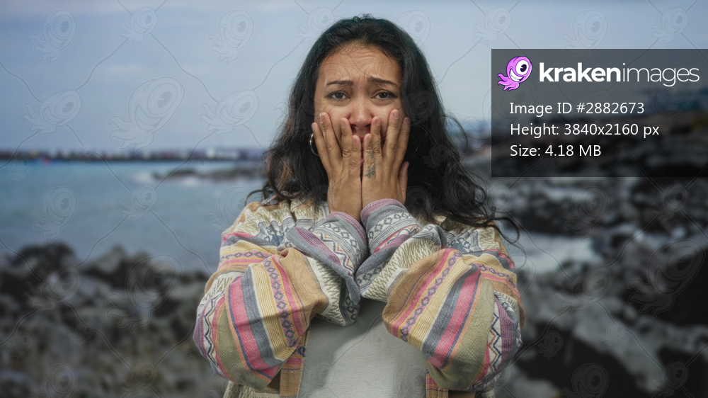Young hispanic woman pressing hands to temples and covering mouth on street near rocky coast; anxiety solitude.