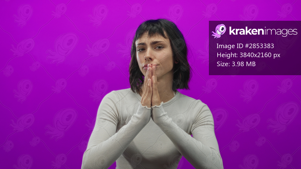 Young hispanic woman pressing hands together in prayer gesture with focused expression in a purple studio; faith hope.