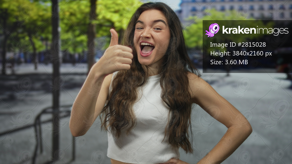 Young hispanic woman with puckered lips points finger to chest and shows thumbs up on city street; confidence.