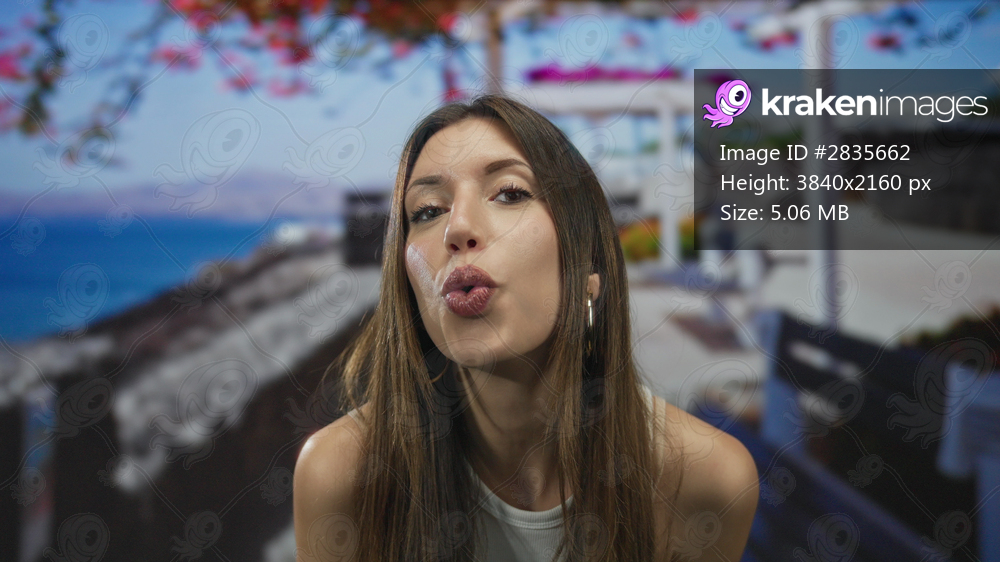 Young hispanic woman puckers lips and blows kiss toward camera while smiling on sunny seaside promenade; flirtation.