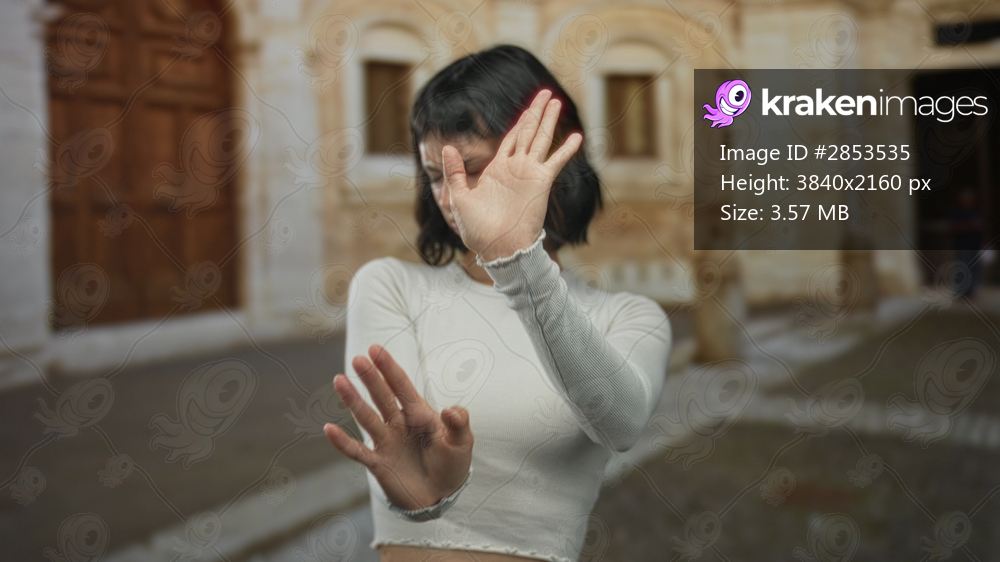 Young hispanic woman pushes her palms forward on street while scrunching her face in refusal; defiance.