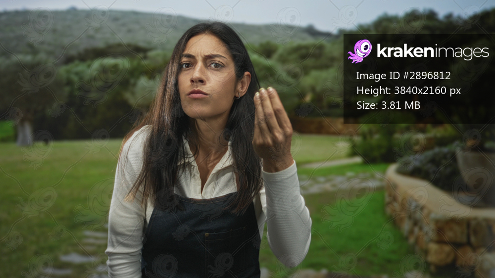 Young hispanic woman with raised hand making a questioning gesture in park near stone path and potted plants; frustration demand answers.