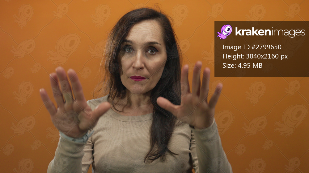 Young hispanic woman raises bare hands palm outward in calm gesture in front of orange studio wall; serenity calm reassurance.