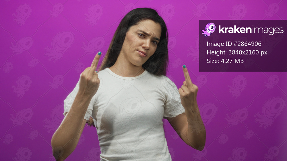 Young hispanic woman raises both middle finger hands and scowls directly at camera in studio; anger defiance.