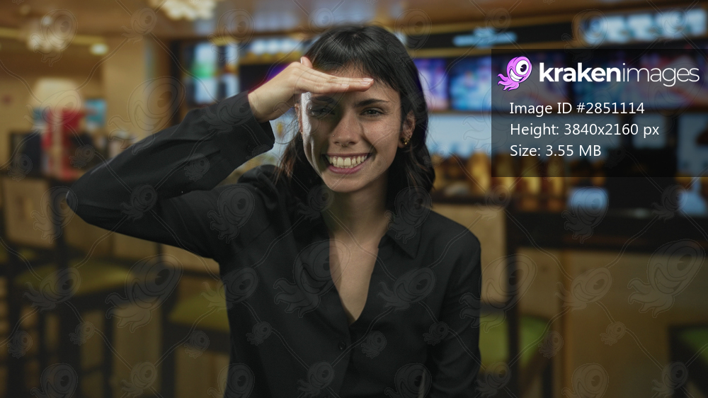 Young hispanic woman raises hand to forehead at bar counter with drink dispensers in restaurant; anticipation.