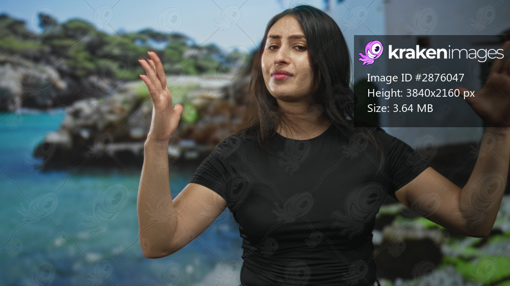 Young hispanic woman raises hands and gestures in front of a seaside building on rocky coast; confusion questioning.