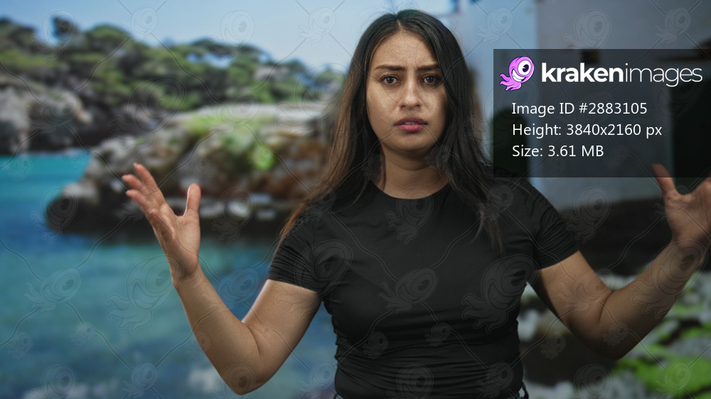 Young hispanic woman raises hands and gestures in front of a seaside building on rocky coast; confusion questioning.