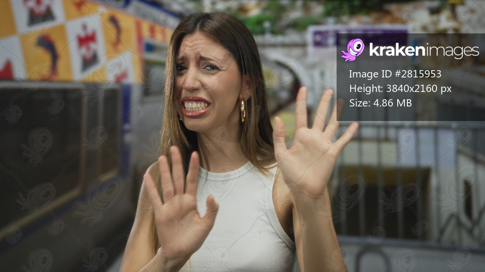 Young hispanic woman raises hands to cover face beside railway train on station building platform; disgust.