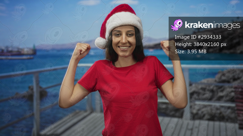 Young hispanic woman raising arms on promenade by the seaside in a santa hat and red shirt; holiday joy.