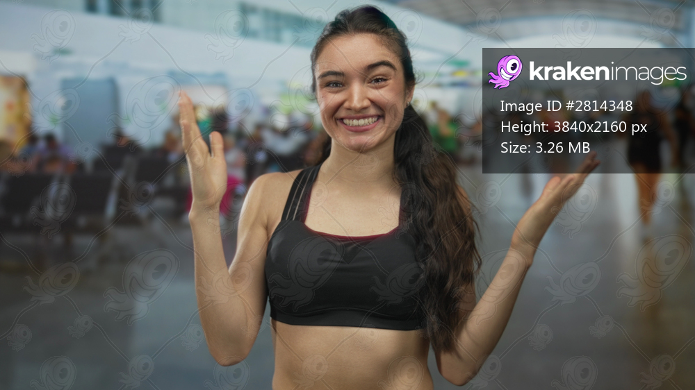 Young hispanic woman raising arms and smiling with closed eyes in the spacious airport terminal; surprise.