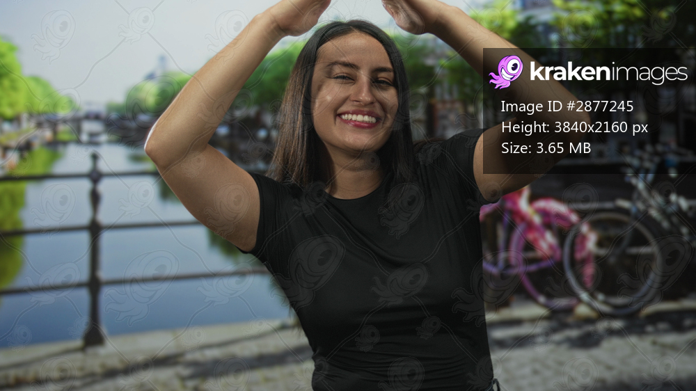 Young hispanic woman raising bare arms on street by amsterdam canal and bicycles, smiling widely; joyful travel play.
