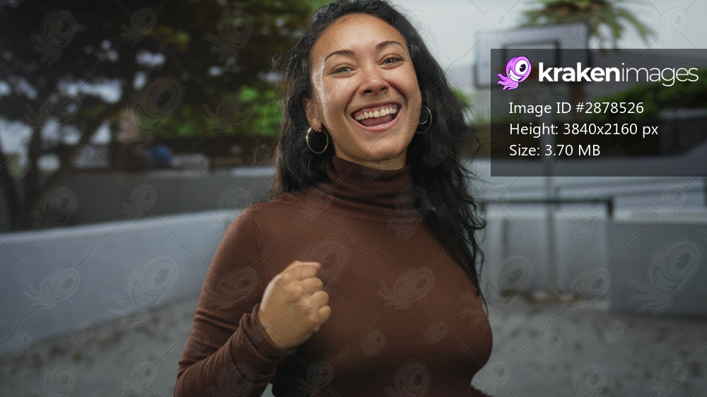 Young hispanic woman raising clenched fists beside an outdoor basketball hoop on street court smiling broadly and celebrating a win; joy victory.