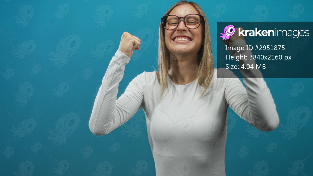 Young hispanic woman raising fists and laughing in a studio with blue backdrop, wearing glasses and white top; joy celebration triumph.