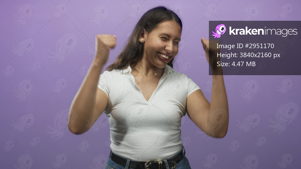 Young hispanic woman raising fists and smiling with bare forearms visible in a purple studio wall victory pose; victory joy.