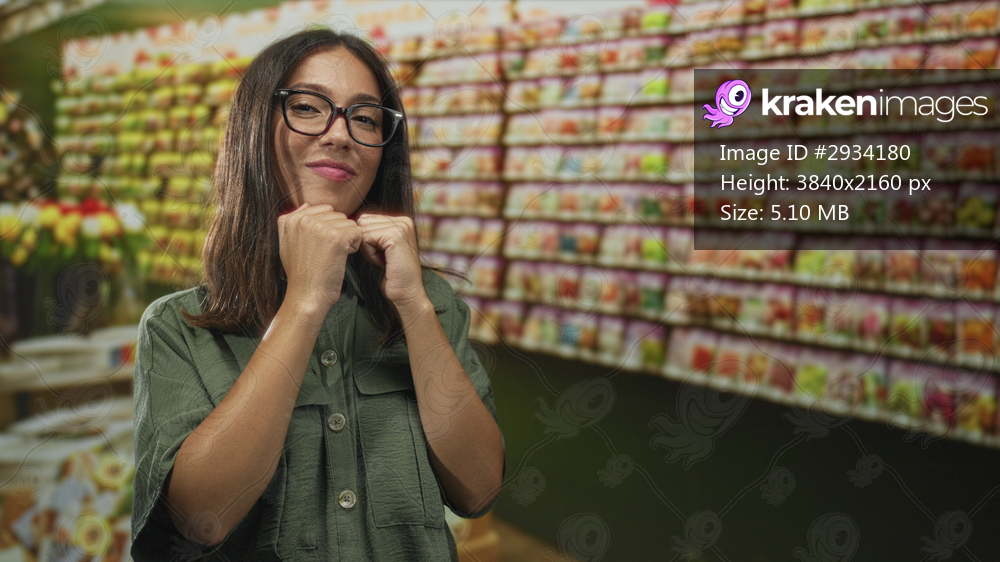 Young hispanic woman raising fists to face in a flower shop aisle wearing glasses and olive shirt; playful defiance.