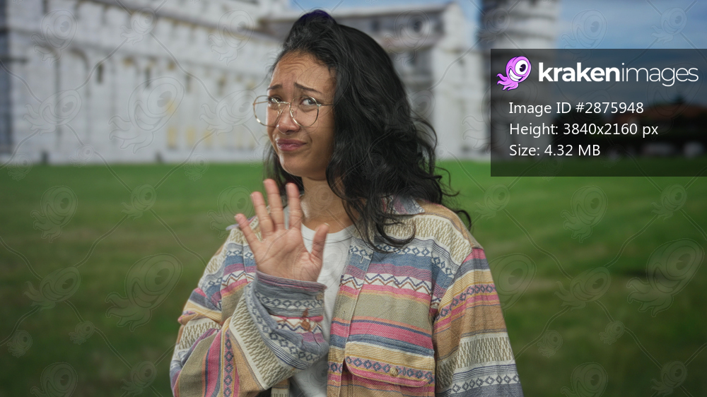 Young hispanic woman raising hand palm out toward camera in front of leaning tower building on a grassy lawn, wearing round glasses and patterned jacket; awkwardness. - Kraken Images