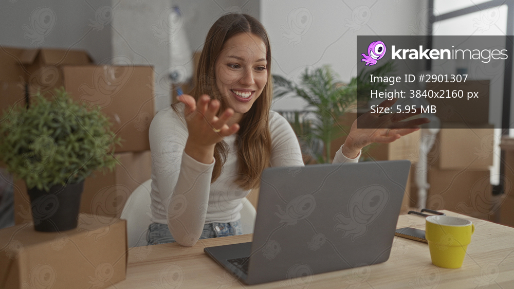 Young hispanic woman raising hands at laptop in building amid packed moving boxes, potted plant and yellow mug on table; excitement.