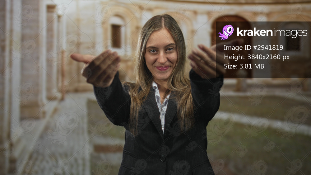 Young hispanic woman reaching with hands outstretched toward camera in front of old stone building; joy welcome.