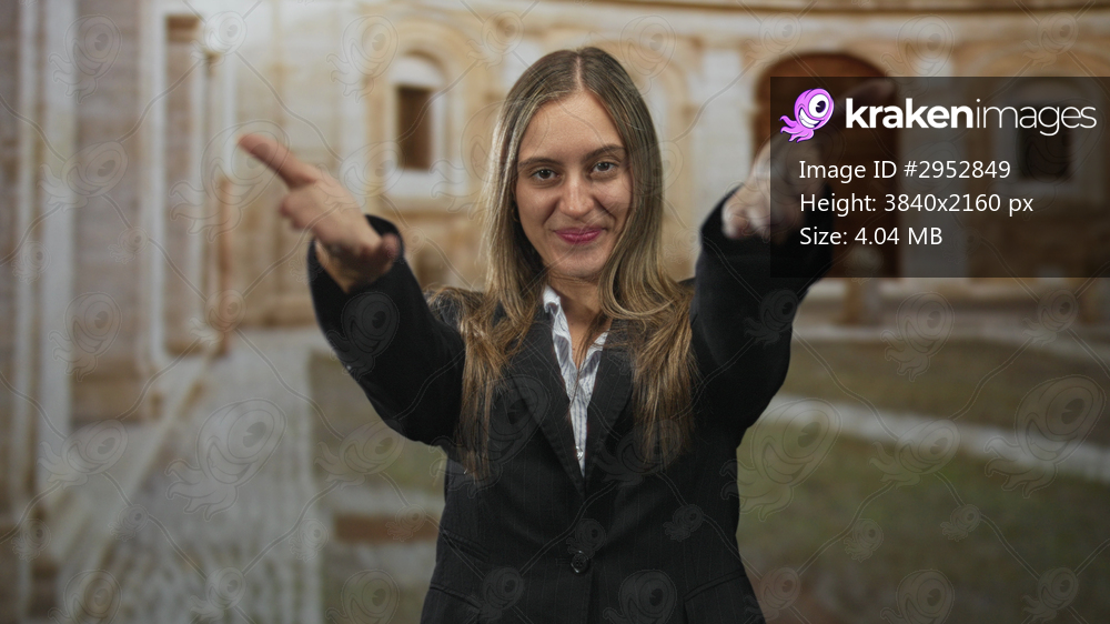 Young hispanic woman reaching with hands outstretched toward camera in front of old stone building; joy welcome.