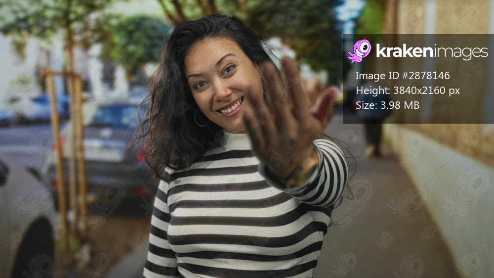 Young hispanic woman reaching out hand toward camera on a busy city street with blurred pedestrians and parked cars; connection joy.