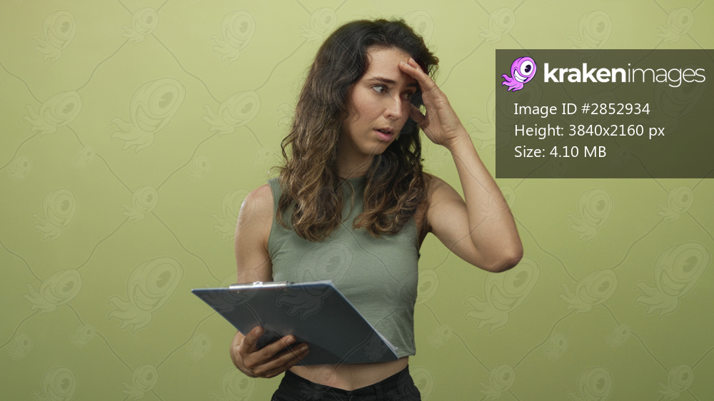 Young hispanic woman reading clipboard in studio while slightly tilting head and touching forehead; concern.