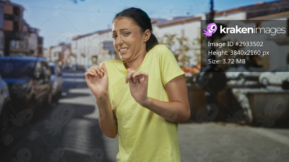 Young hispanic woman recoiling with hands raised and grimaced face in a yellow t shirt on a busy street; disgust.