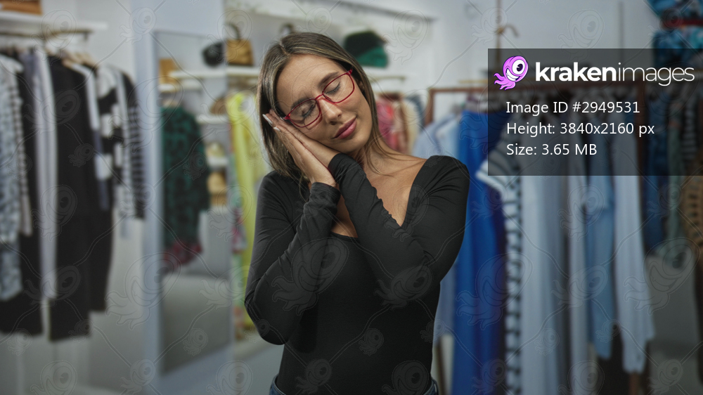 Young hispanic woman with red glasses and hands clasped to cheek, eyes closed among hanging clothes in building; calm relaxation.