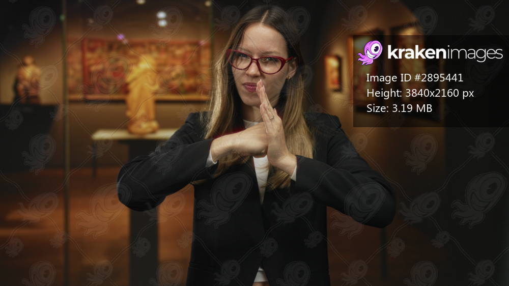 Young hispanic woman with red glasses makes timeout hand gesture in an art gallery building, scowling and leaning slightly forward; art critique defiance. - Kraken Images