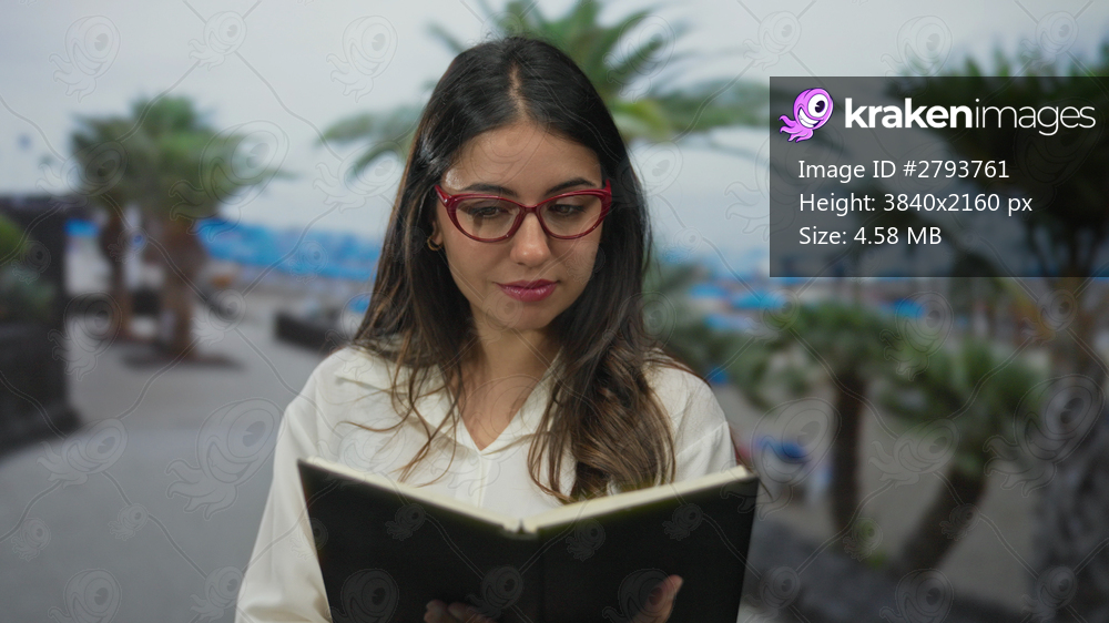Young hispanic woman with red glasses reads a book by the seaside, surrounded by palm trees on the beach, conveying a sense of outdoor relaxation and leisure. - Kraken Images