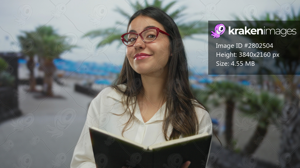 Young hispanic woman with red glasses reads a book by the seaside, surrounded by palm trees on the beach, conveying a sense of outdoor relaxation and leisure. - Kraken Images