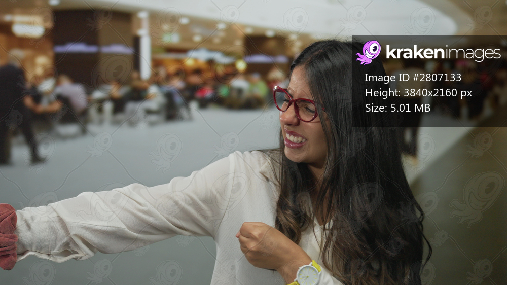 Young hispanic woman with red glasses tugging rope gesture in busy airport terminal; determination effort.