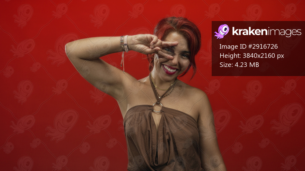 Young hispanic woman with red hair showing bare arms and peace sign to eyes in red studio; playful confident mood.
