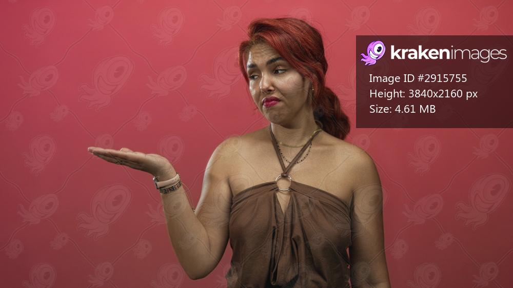 Young hispanic woman with red hair shrugging with palm up hand and exposed shoulder in pink studio; skepticism questioning.