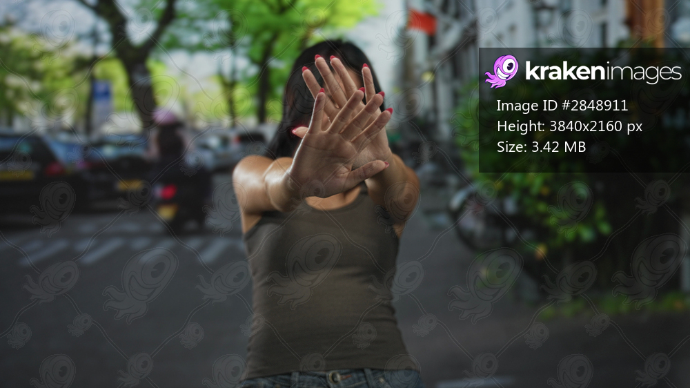 Young hispanic woman with red manicure pushes palms forward on busy city street under leafy trees; embarrassment.