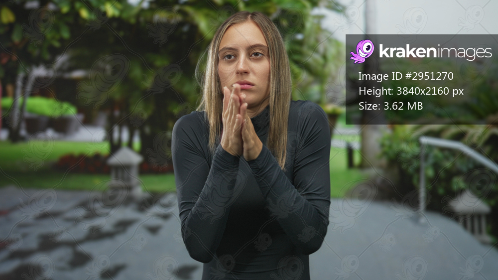 Young hispanic woman rubbing hands together on a garden walkway near a stone lantern and palm tree; nervous.
