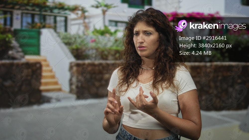 Young hispanic woman rubbing her finger and checking a ring while frowning on a street near white building and stone wall; frustration doubt.