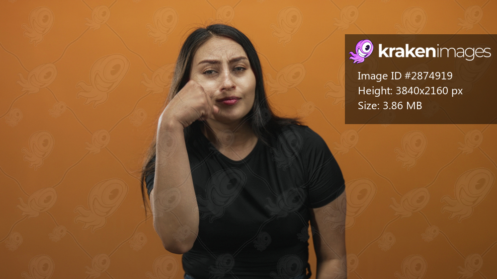 Young hispanic woman rubs eye and clenches fist in studio against an orange backdrop; frustration resilience determination.